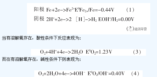 所用材料的鑄鐵屑和活性碳或焦碳,鑄鐵屑是鐵和碳的合金,其內(nèi)部主要由純鐵和碳化鐵(Fe3C)組成,其中Fe3C以極為細小的微粒分散在鐵屑內(nèi)。當將鑄鐵鐵屑浸沒在電解質(zhì)溶液中時,由于Fe3C比純鐵更耐腐蝕,二者之間存在著明顯的氧化還原電勢差,這樣便在純鐵和碳化鐵之間形成了無數(shù)多個細微原電池,純鐵為陽極,F(xiàn)e3C為陰極。另一方面鐵屑與活性碳形成較大的原電池,鑄鐵為陽極,碳為陰極,使鐵屑在受到微原電池腐蝕的基礎(chǔ)上,又受到較大原電池的腐蝕。在這些細微原電池中,陽極在電池反應(yīng)中表現(xiàn)為失去電子被氧化,而陰極得到電子被還原,但反應(yīng)比較復(fù)雜。在微電池中電極反應(yīng)為: